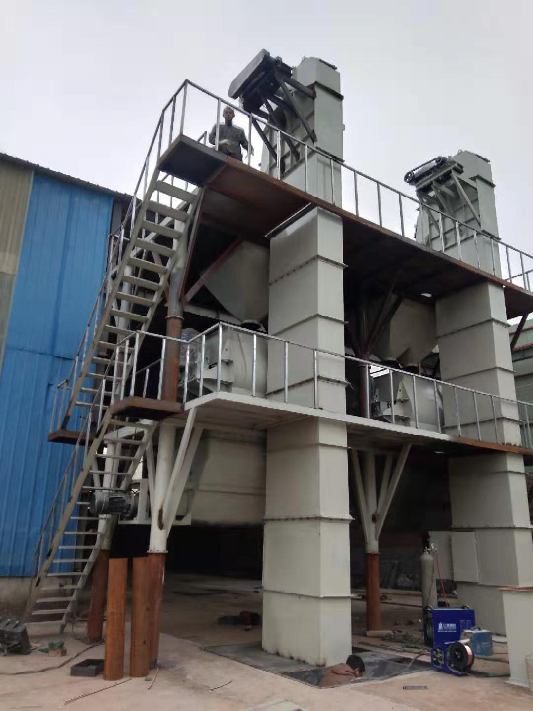 本次干混砂浆设备为双机型生产线,该套设备采用连体式框架结构,框架层次分为上中下三层,自上而下的机构中,等层设备为待混层,主要设备包括待混仓,用于预存计量 好的干混砂浆原材料。中层为混合层,主要设备为一台3m³双轴桨叶无重力混合机,和一台4m³双轴桨叶无重力混合机。底层为成品层,主要设备为成品待混仓以及包装设备。